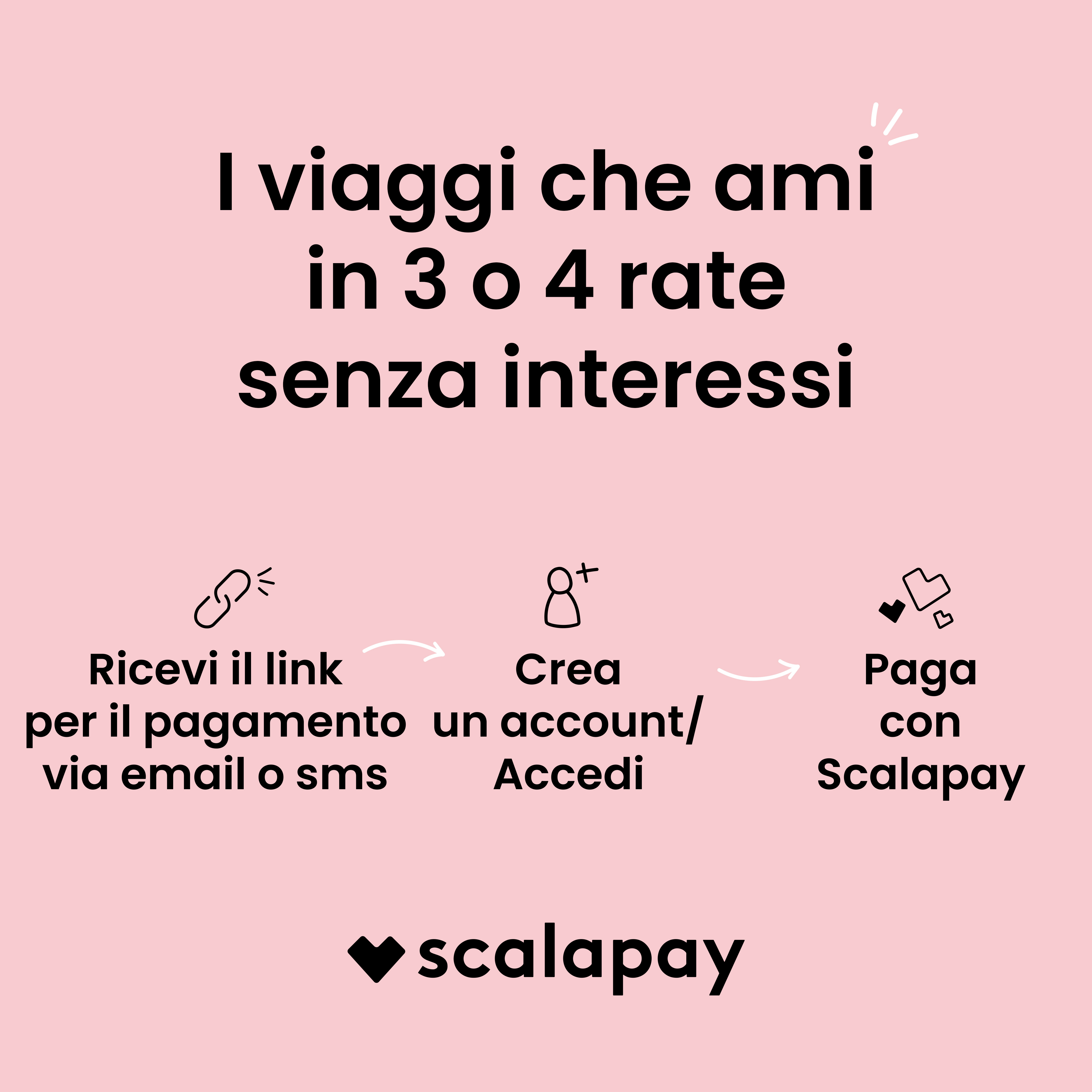 Visita www.scalapay.com/it/ per tutte le condizioni e richiedi in fase di acquisto il link per effettuare la rateizzazione del tuo prossimo viaggio
